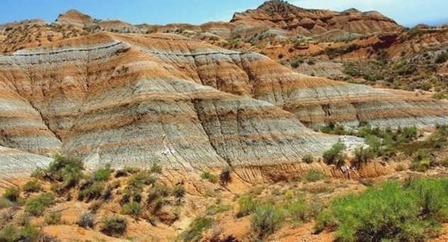 Пейзаж как будто из фантастических фильмов об иных планетах. Здесь снимался в советское время знаменитый фильм «Кыз Жибек». За свой экзотический окрас горы получили название в народе «Тигровые горы». Такой необычный окрас, похожи на шкуры тигра, им придают слои глиняных пород различных цветов: желтого, белого, красного. А за миллионы лет, под действием осадков, ветров и воды, горы приобрели еще и причудливые формы.