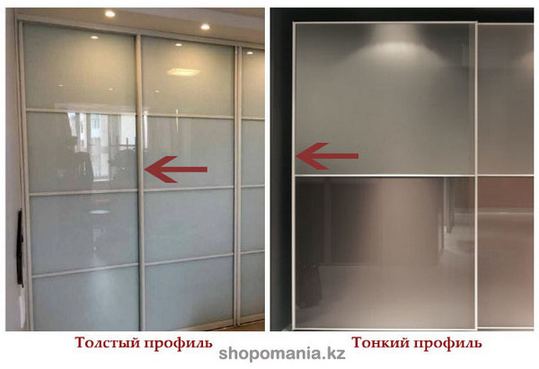 Еще обратите внимание на профиль. Выбирайте тонкий профиль. Тонкий профиль выглядит современно, аккуратно, стильно. Толстый профиль не только показывает мебель устаревшей, но и визуально сильно утяжеляет внешний вид, делая дизайн громоздким.
