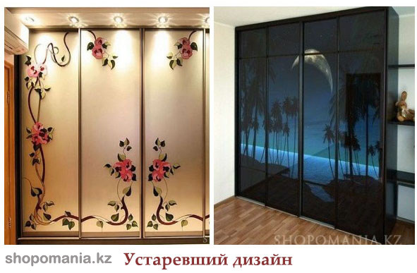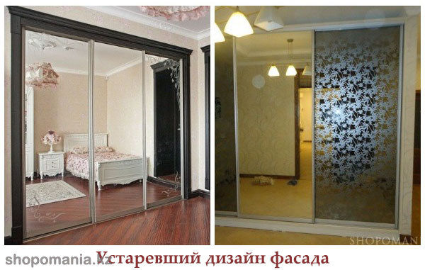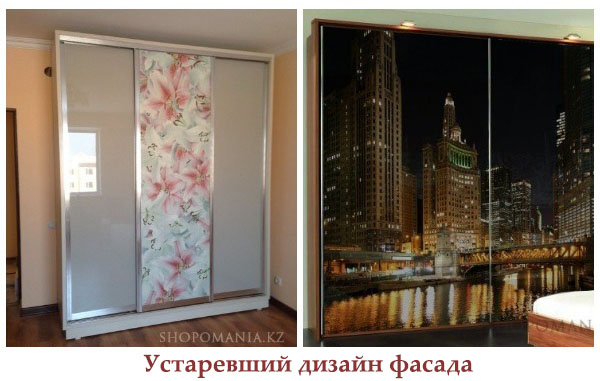 Какие фасады шкафов-купе считаются устаревшими? Например, пескоструйный рисунок, шелкография, с фотопечатью, со вставками с узорчатым стеклом, толстым профилем – это устаревший дизайн.