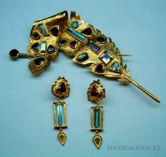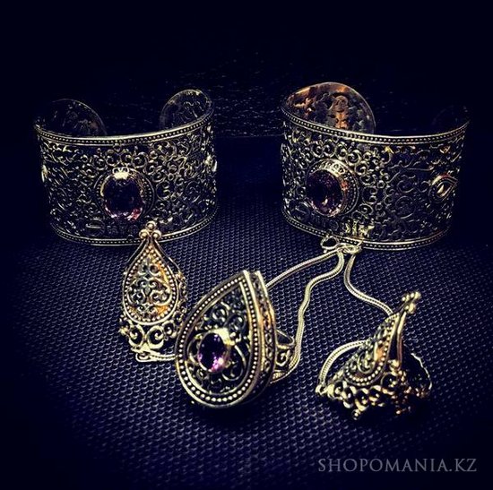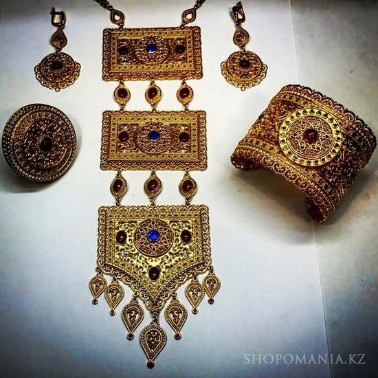 ![Казахские национальные украшения]() Комплект в казахском стиле, изготовлен из золота 585 пробы, вставки сапфир, рубин, аметист.