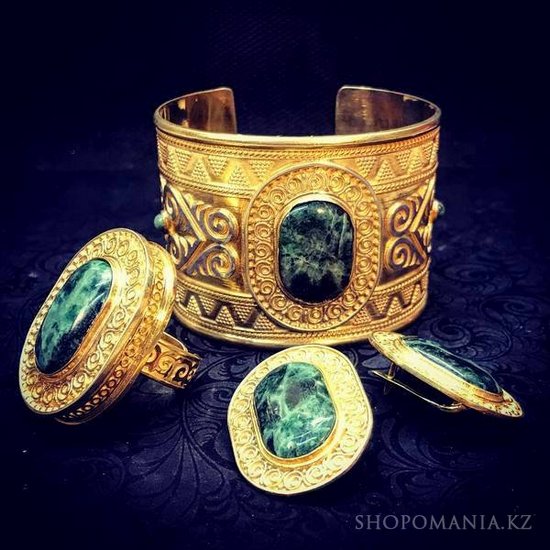 ![Ювелир в Казахстане]() Подарочный комплект "Асыл Ана" с родовым танба "КОЖА", серебро 925 пробы, покрыта золотом 24 карат, вставки халцедон.