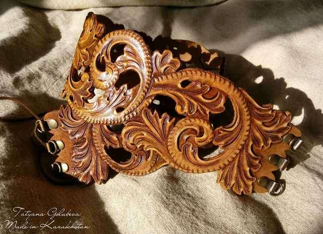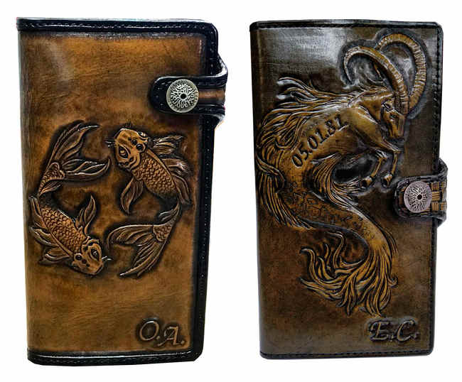 Посмотрите на фотографии. Вот так роскошно, стильно и практично выглядят готовые кожаные изделия ручной работы, изготовленные по уникальной технологии, с использованием резьбы и ручного тиснения по коже, в различных стилях. Здесь каждый элемент, дизайн, орнаменты и крой индивидуальны. Изображение становится 3-х мерным.