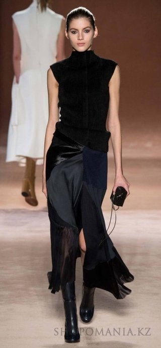 Чтобы не отвлекать внимание от получившихся «мозаик» из множества разных материалов, дизайнер выбрала простые и «чистые» силуэты: туники и брюки – свободного кроя, шерстяные пальто-халаты, прямые жакеты, платья-футляры и длинные в пол платья-колоны, слегка расклешенные юбки.