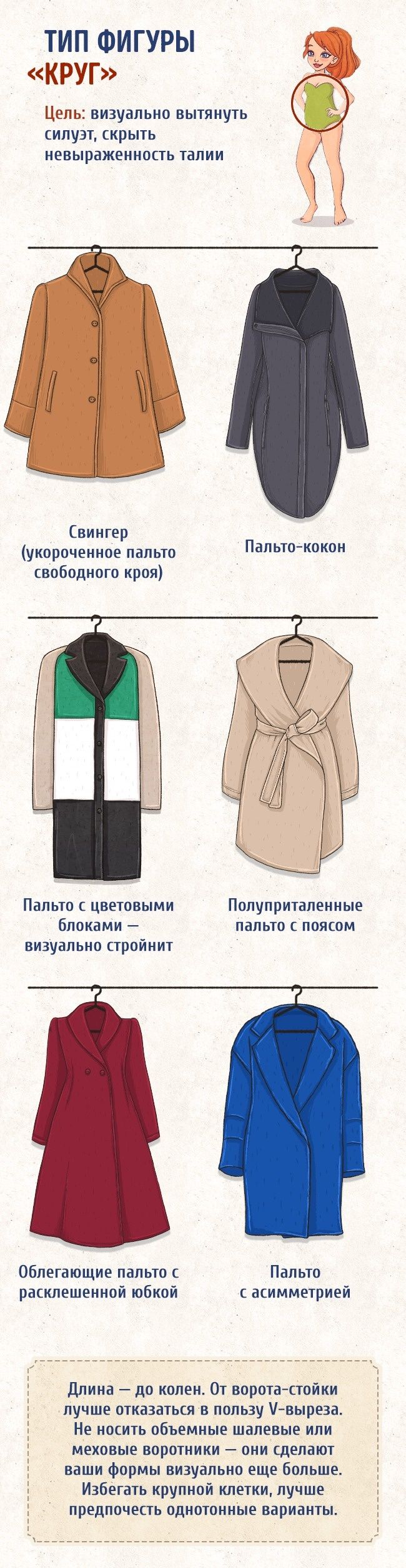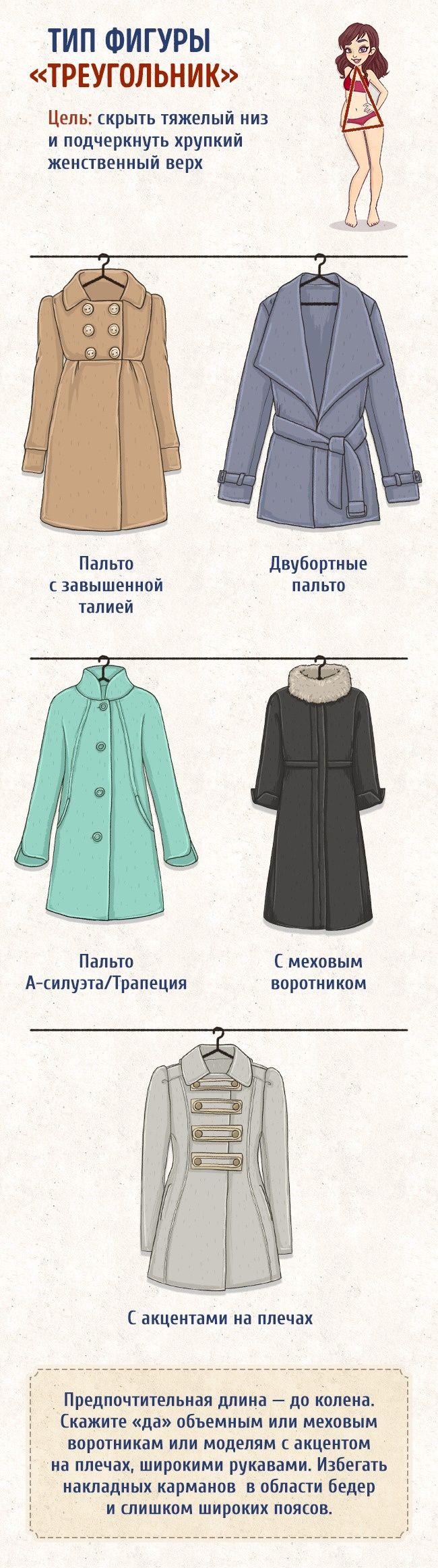 Итак, как же правильно выбрать пальто? Какой фасон пальто выбрать для женщин с фигурой «песочные часы» или «треугольник»? Что стилисты советуют «худышкам», а что - «пышечкам»? Какие модели сделают вас визуально выше и стройнее? На что нужно обратить внимание на примерке? Обо всем этом мы расскажем в нашей статье. Инфографика в статье с сайта www.adme.ru.