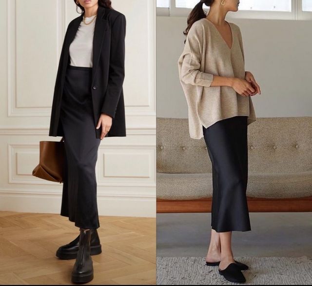- Юбка-карандаш классической длины. Сейчас актуальны также юбки-плиссе, можно даже сложного кроя, главное, чтобы цвета были спокойные. На юбки-макси тоже обратите внимание. В моде сезона Осень-зима 2022 юбки макси мелькали практически во всех коллекциях модных дизайнеров.