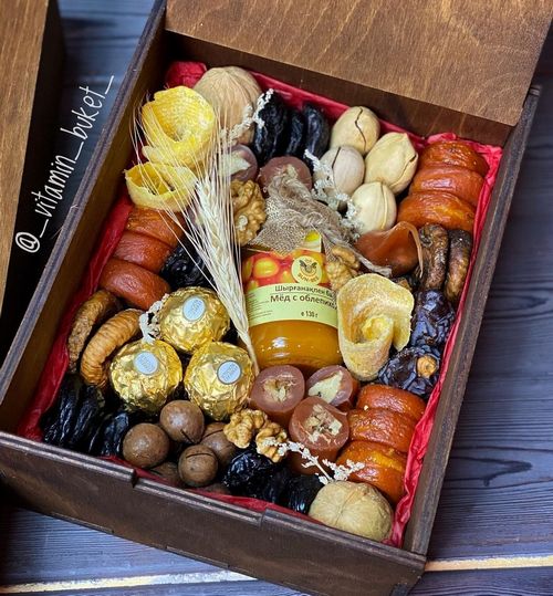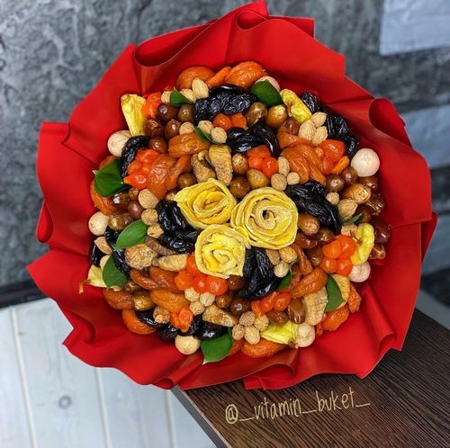 2. Букет из сухофруктов. Сухофрукты могут быть и в коробке. Полезный и оригинальный подарок. По цене такой букет будет стоить как средний букет цветов. Где заказать букет из сухофруктов? Зайти в инстаграм. Сейчас мастера изготавливают на заказ букеты и корзины из сухофруктов с разной начинкой. Можно добавить баночку меда или оригинального варенья.
