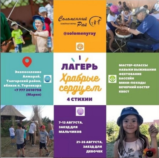 Уже несколько лет работает походный эколагерь "Храбрые сердцем", расположенный в 30 км от Алматы в п. Алмарай на семейной ферме "Соломенный рай". Помимо свежего воздуха, экологически чистой еды, интересна программа лагеря, которая охватывает эмоционально-креативную, физическую, интеллектуальную и потребность развития внутренних личностных качеств.