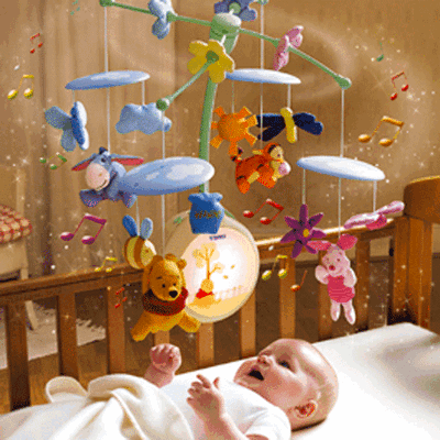 - Музыкальный мобиль для кроватки, можно электрический. Ребенок потом будет следить за вращающимися игрушками карусели. Мобиль быстро успокаивает малыша.