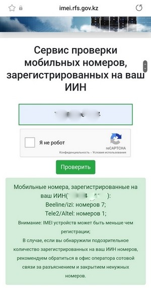Благо проверить сколько на вас зарегистрировано номеров телефонов не сложно, все несколько секунд. В Казахстане есть государственный сервис проверки мобильных телефонов зарегистрированных на ваш ИИН. Достаточно ввести свой ИИН и сервис сразу покажет количество номеров на вашем ИИН по разным операторам сотовой связи. Адрес сервиса - https://imei.rfs.gov.kz/index_ru.php