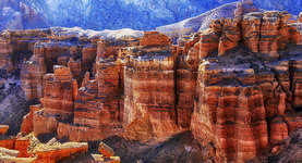 А для тех, кто уже побывал в Чарынском каньоне днем – можно съездить туда ночью. Есть туристический маршрут «Ночной Чарын». Чарынский каньон ночью с его башнями, столбами, стенами, силуэтами – это марсианский ландшафт, мириады звезд над головой, яркая и огромная луна. Каньон при свете луны меняет цвет с глиняно-желтого на темно-красный.