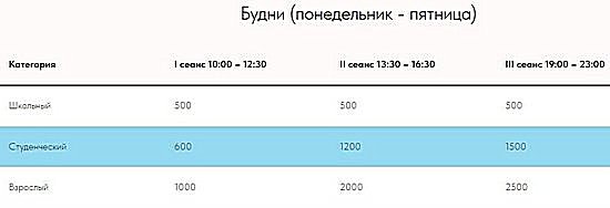Например, в будни - дневной билет с 9.00 до 17.00: дети до 6 лет - бесплатно, молодежный от 7 до 17 лет - от 1 500 тг., взрослый билет - от 1 000 тг.